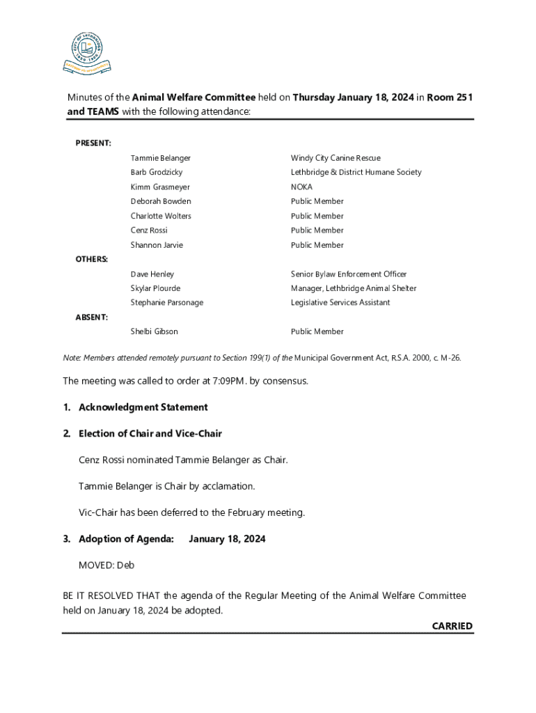 Minutes of the Animal Welfare Committee held on Thursday, January 18, 2024, in Room 251
