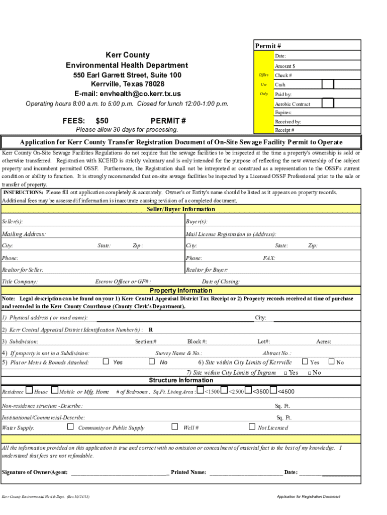 Permit #Kerr County Environmental Health Departmental: Amount $550 Earl Garrett Street, Suite 100 Kerrville, Texas 78028 Email: envhealth@co.kerr.tx.usOfficeCheck #UseCashOnlyPaid by:Operating hours