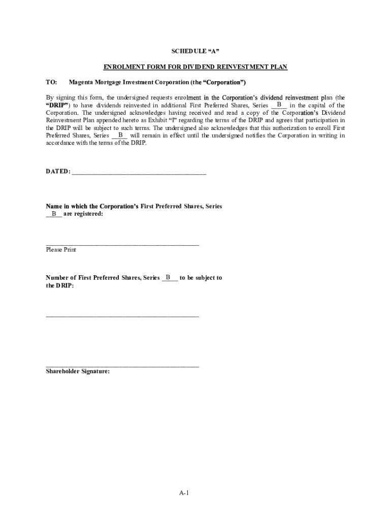 SCHEDULE A Enrollment FORM FOR DIVIDEND REINVESTMENT PLAN TO:Magenta Mortgage Investment Corporation (they signing this form, the undersigned requests euro a (the B in the capital of the) to have