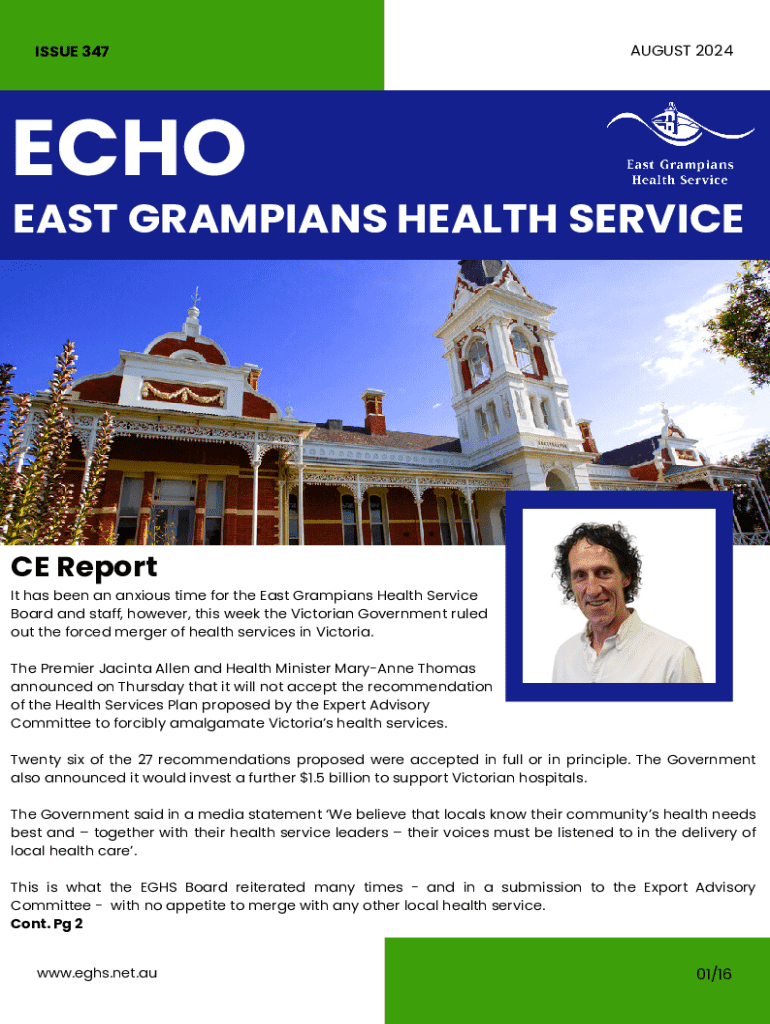 ISSUE 347AUGUST 2024ECHOEAST GRAMPIANS HEALTH SERVICE CE Report It has been an anxious time for the East Grampians Health Service Board and staff, however, this week the Victorian Government ruled