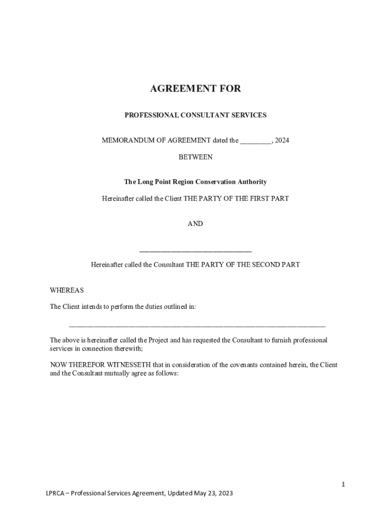 AGREEMENT FOR PROFESSIONAL CONSULTANT SERVICES MEMORANDUM OF AGREEMENT dated the ___, 2024 BETWEEN The Long Point Region Conservation Authority Hereinafter called the Client THE PARTY OF THE FIRST