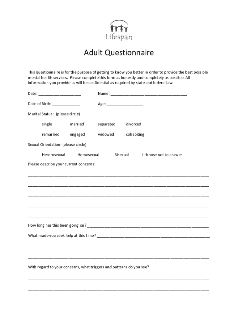Adult Questionnaire This questionnaire is for the purpose of getting to know you better in order to provide the best possible mental health services. Please complete this form as honestly and completely