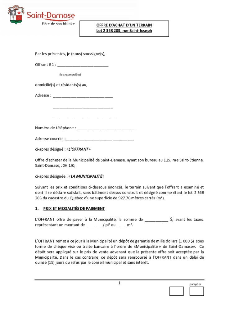 OFF RE DACHAU DUN TERRAIN Lot 2 368 203, rue SaintJosephPar LES presented, JE (nous) sous sign(s), Off rant # 1 : ___ (letters modules)domicile(s) et residents(s) Au, Address : ___ ___ ___ Humor de