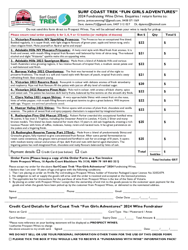 SURF COAST TREK FUN GIRLS ADVENTURES 2024 Fundraising Wine Drive. Inquiries / return forms to: Janice, janicecumming7@gmail.com, 0408 071 069 Dani, danimc72@gmail.com, 0407 312 027 Di, dipianto@hotmail.comDo