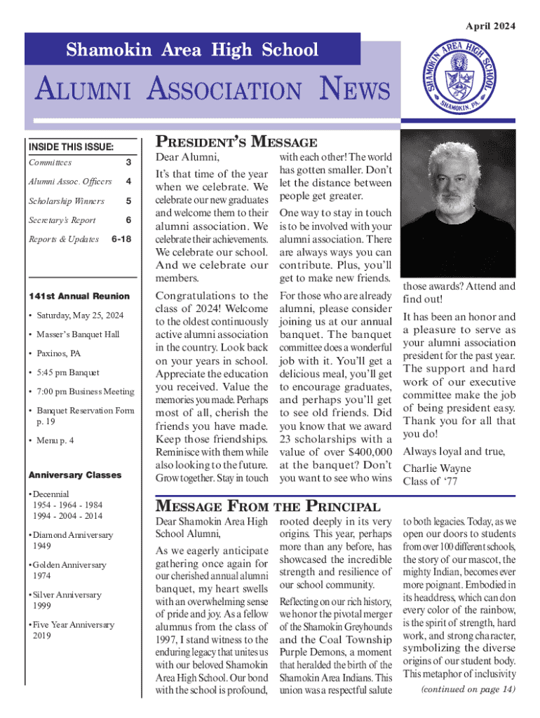 April 2024Shamokin Area High SchoolAlumni Association News Presidents MessageINSIDE THIS ISSUE: Committees3Alumni Assoc. Officers4Scholarship Winners5Secretarys Report6Reports & Updates618141st Annual