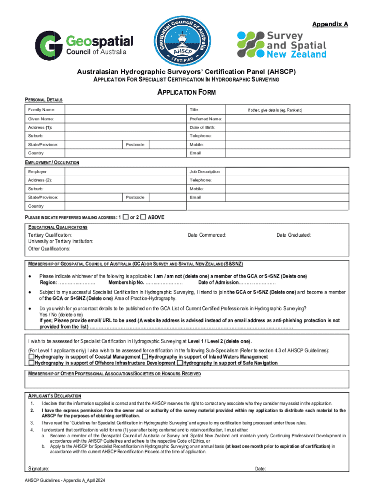 Apply for Specialist Certification in Hydrographic Surveying with the AHSCP. Complete the application with required details and adhere to guidelines for certification.