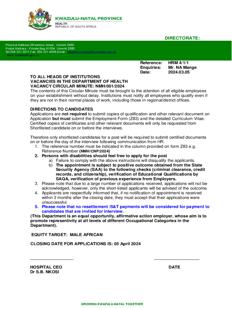 DIRECTORATE: Physical Address 28 kantoor street , Utrecht 2980 Postal Address : Private Bag X1004 Utrecht 2980 Tel 034 331 3011 Fax: 034 331 4498 Email : ndumiso.mange@kznhealth.gov.za www. Kznhealth.gov.zaReference: