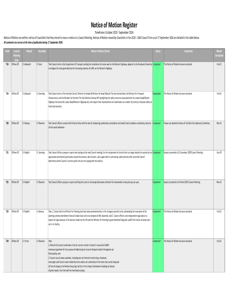 Notice of Motion Register Timeframe: October 2020 September 2024 Notices of Motion are written notices of Councillors that they intend to move a motion at a Council Meeting. Notices of Motion moved