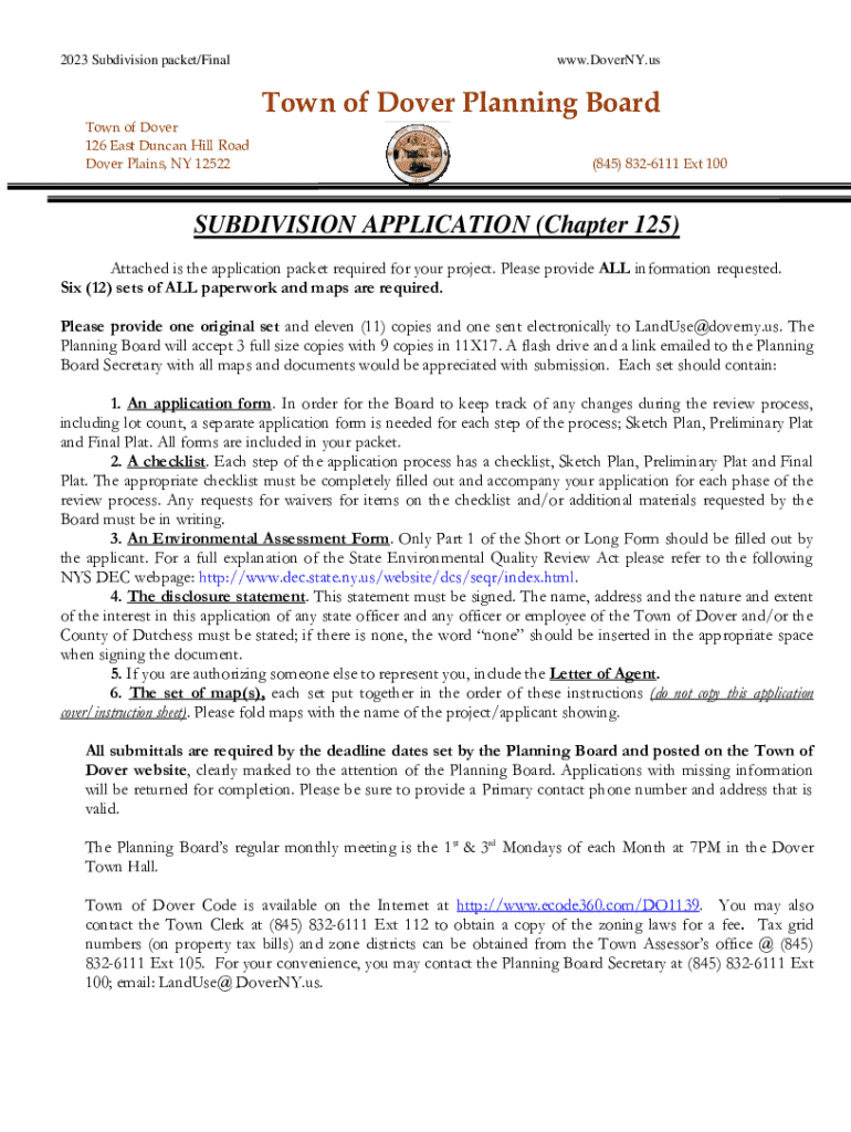 2023 Subdivision packet/Final. DoverNY.uptown of Dover Planning Board Town of Dover 126 East Duncan Hill Road Dover Plains, NY 12522(845) 8326111 Ext 100SUBDIVISION APPLICATION (Chapter 125) Attached