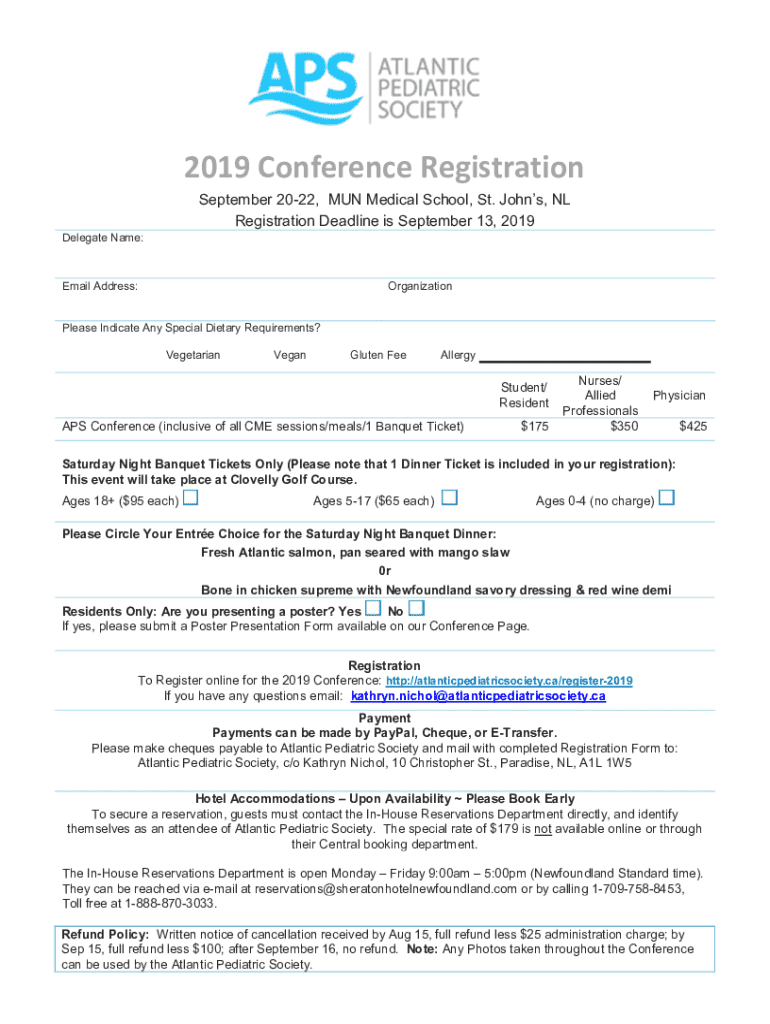 Register for the 2019 Atlantic Pediatric Society Conference, September 20-22, at MUN Medical School. Various delegate options and special dietary requests available.