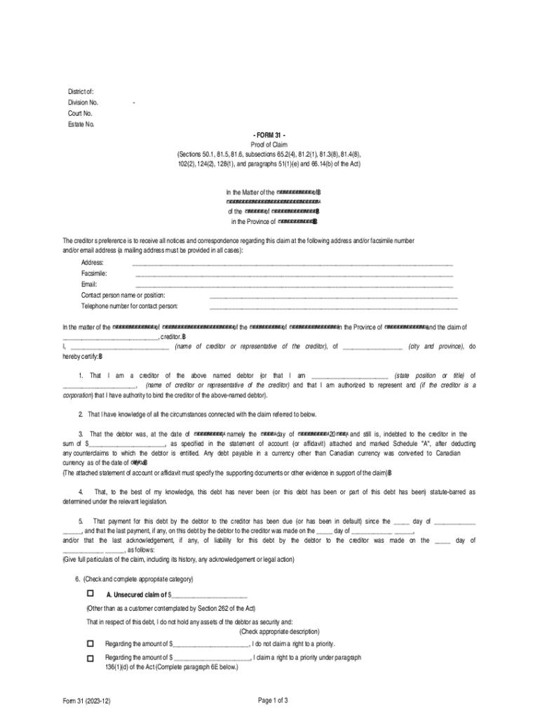 District of: Division No. Court No. Estate No. FORM 31 Proof of Claim (Sections 50.1, 81.5, 81.6, subsections 65.2(4), 81.2(1), 81.3(8), 81.4(8), 102(2), 124(2), 128(1), and paragraphs 51(1)(e) and