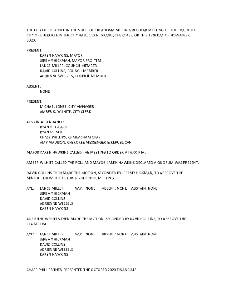 THE CITY OF CHEROKEE IN THE STATE OF OKLAHOMA MET IN A REGULAR MEETING OF THE CDA IN THE CITY OF CHEROKEE IN THE CITY HALL, 112 N. GRAND, CHEROKEE, OK THIS 18th DAY OF NOVEMBER 2020. PRESENT: KAREN