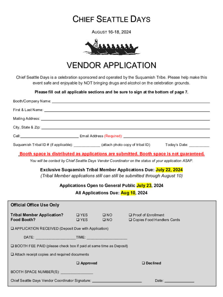 To fill out the Chief Seattle Days vendor application, provide necessary business information, including contact details, type of goods or services offered, and any required permits or licenses.