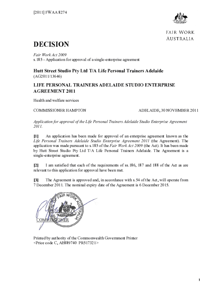[2011] FAA 8274DECISION Fair Work Act 2009 s.185 Application for approval of a single enterprise agreementHutt Street Studio Pty Ltd T/A Life Personal Trainers Adelaide (AG2011/13646)LIFE PERSONAL
