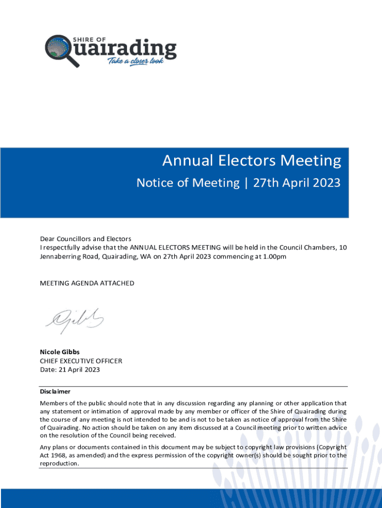 Annual Electors Meeting Notice of Meeting | 27th April 2023Dear Councillors and Electors I respectfully advise that the ANNUAL ELECTORS MEETING will be held in the Council Chambers, 10 Jennaberring