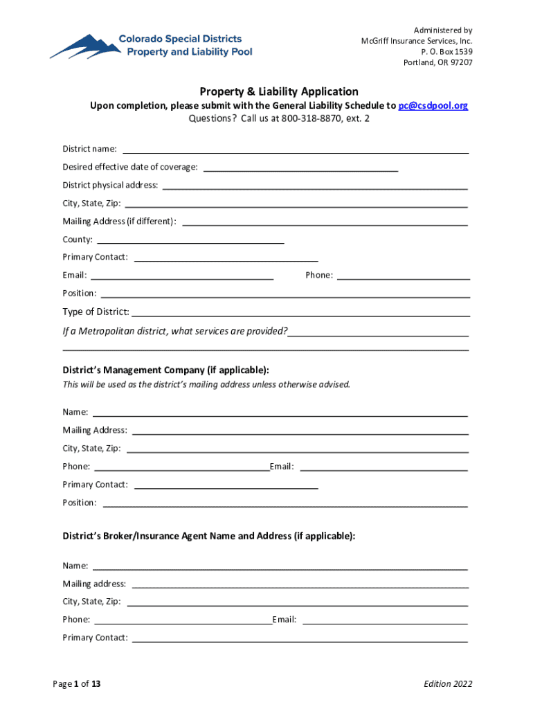 Administered by McGriff Insurance Services, Inc. P. O. Box 1539 Portland, OR 97207Property & Liability Application Upon completion, please submit with the General Liability Schedule to pc@csdpool.org