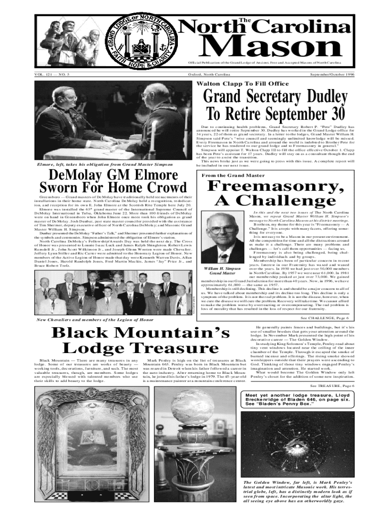 Explore the significant events in the September/October 1996 edition of The North Carolina Mason, featuring leadership changes, membership challenges, and charity insights.