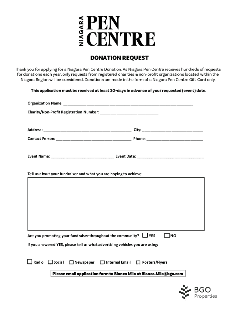 DONATION REQUEST Thank you for applying for a Niagara Pen Center Donation. As Niagara Pen Center receives hundreds of requests for donations each year, only requests from registered charities & nonprofit