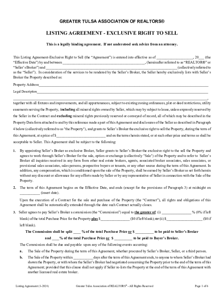 GREATER TULSA ASSOCIATION OF REALTORSLISTING AGREEMENT EXCLUSIVE RIGHT TO SELL This is a legally binding agreement. If not understood seek advice from an attorney. This Listing AgreementExclusive