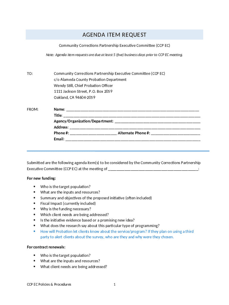 The Agenda Item Request is a writable document that has to be filled-out and signed for certain reasons. Then, it is provided to the exact addressee in order to provide specific details of certain kinds. The completion and signing may be done manually or with a trusted application e. g. PDFfiller. These services help to send in any PDF or Word file without printing them out. While doing that, you can edit its appearance according to your requirements and put an official legal digital signature. Once finished, the user sends the Agenda Item Request to the respective recipient or several of them by email and even fax. PDFfiller has a feature and options that make your Word form printable. It includes a number of options for printing out. No matter, how you will file a form - physically or by email - it will always look neat and organized. In order not to create a new writable document from scratch over and over, turn the original Word file as a template. Later, you will have an editable sample.