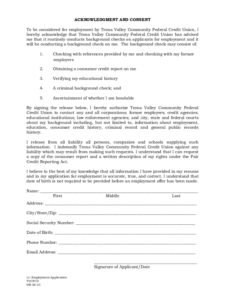 ACKNOWLEDGMENT AND CONSENT To be considered for employment by Trina Valley Community Federal Credit Union, I hereby acknowledge that Trina Valley Community Federal Credit Union has advised me that