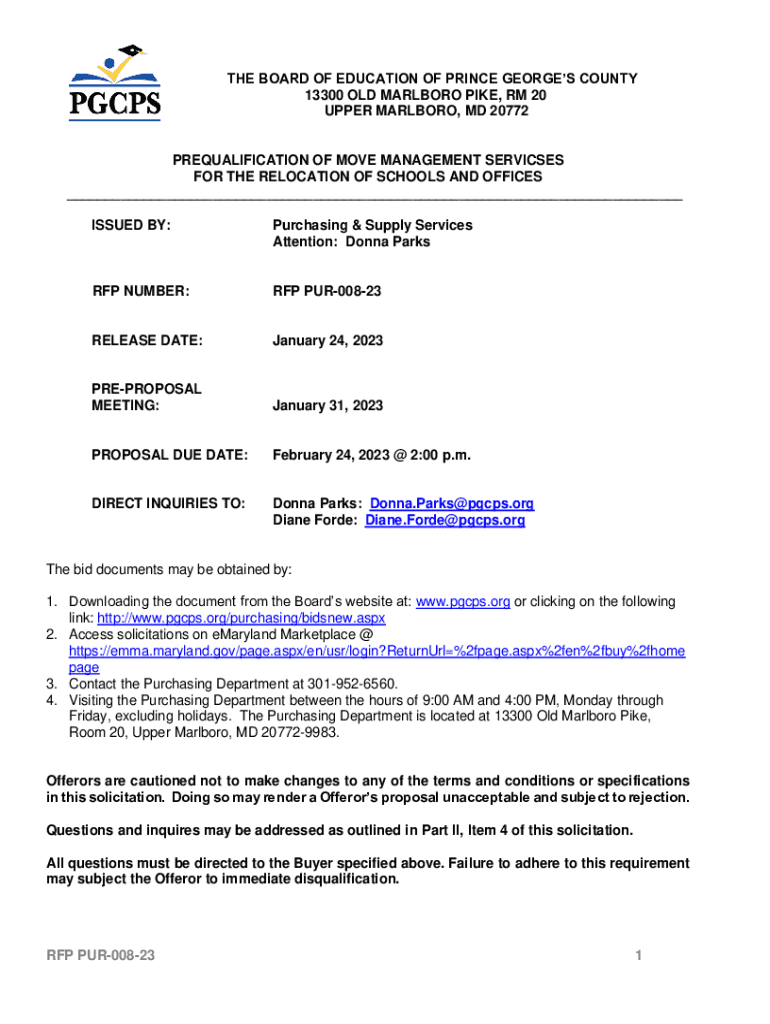 THE BOARD OF EDUCATION OF PRINCE GEORGES COUNTY 13300 OLD MARLBORO PIKE, RM 20 UPPER MARLBORO, MD 20772PREQUALIFICATION OF MOVE MANAGEMENT SERVICSES FOR THE RELOCATION OF SCHOOLS AND OFFICES ___ ISSUED