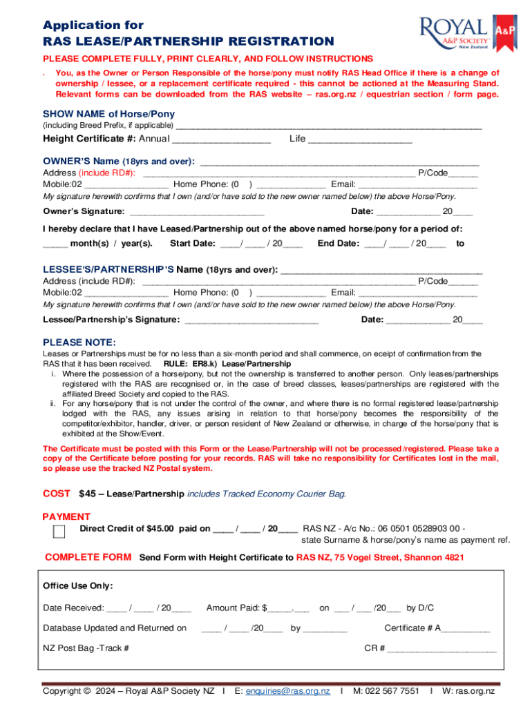 Register your horse/pony lease or partnership with RAS. Complete the application fully to ensure proper processing and compliance with regulations.