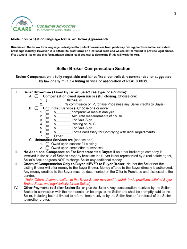 3Model compensation language for Seller Broker Agreements. Disclaimer: The below form language is designed to protect consumers from predatory pricing practices in the real estate brokerage industry.