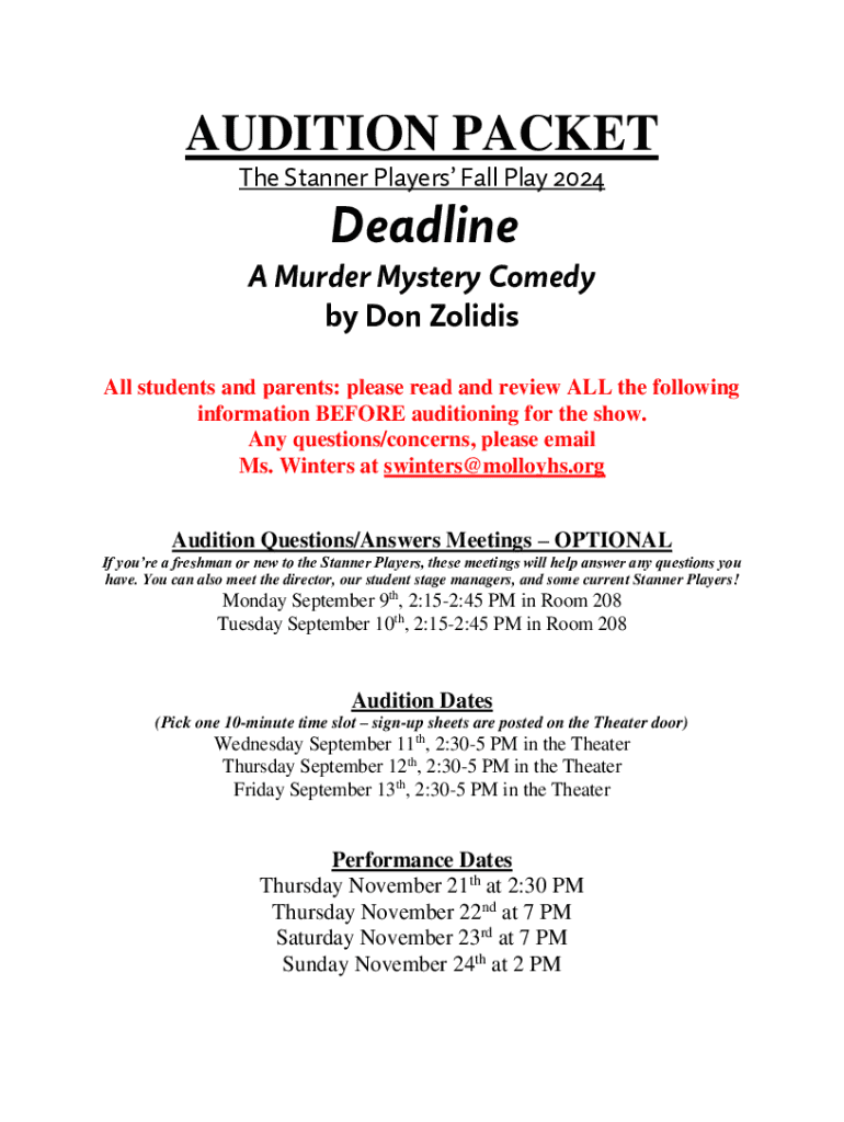 AUDITION PACKET The Stanner Players Fall Play 2024Deadline A Murder Mystery Comedy by Don Zolidis All students and parents: please read and review ALL the following information BEFORE auditioning