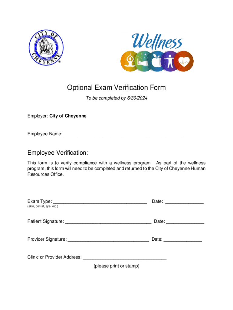 Complete this Optional Exam Verification Form for wellness program compliance by 6/30/2024. Ensure timely submission to the City of Cheyenne Human Resources.