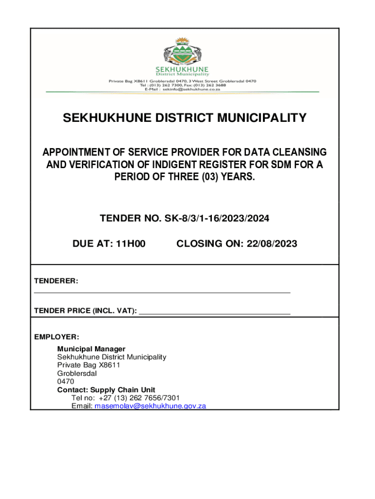 This document outlines the tender SK-8/3/1-16/2023/2024 for the appointment of a service provider for data cleansing and verification of the indigent register for Sekhukhune District Municipality.