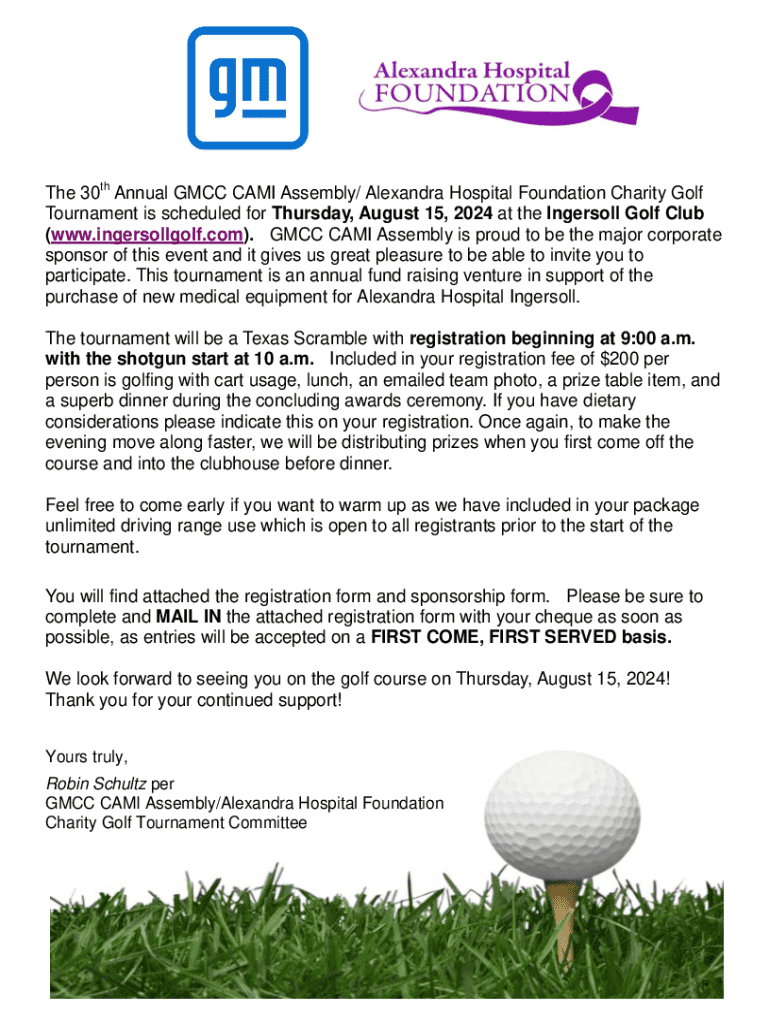 The 30th Annual GCC CAME Assembly/ Alexandra Hospital Foundation Charity Golf Tournament is scheduled for Thursday, August 15, 2024, at the Ingersoll Golf Club (www.ingersollgolf.com). GCC CAME Assembly
