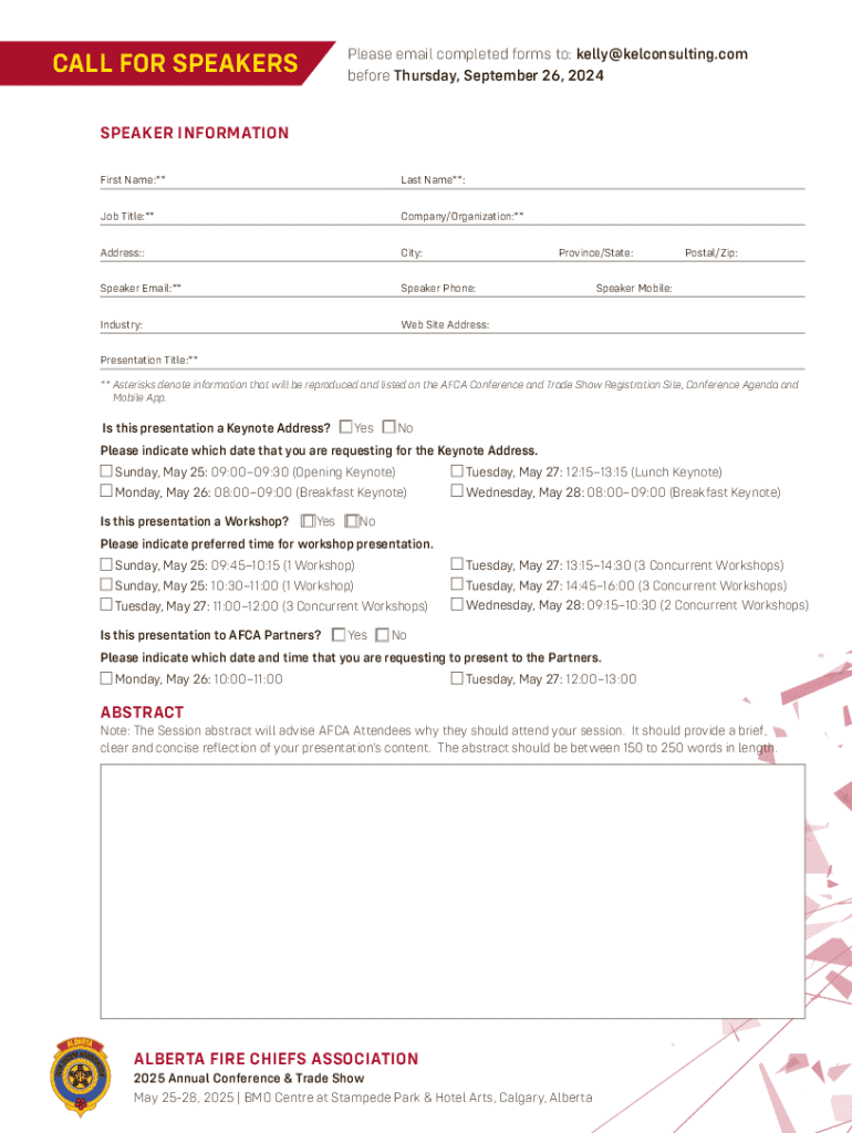 ALBERTA FIRE CHIEFS ASSOCIATION 2025 ANNUAL CONFERENCE & TRADE SHOW May 25 28, 2025CALL FOR SPEAKERS DETAILS OF SUBMISSIONS The AFCA is releasing a call for speakers for the 78th Annual Conference