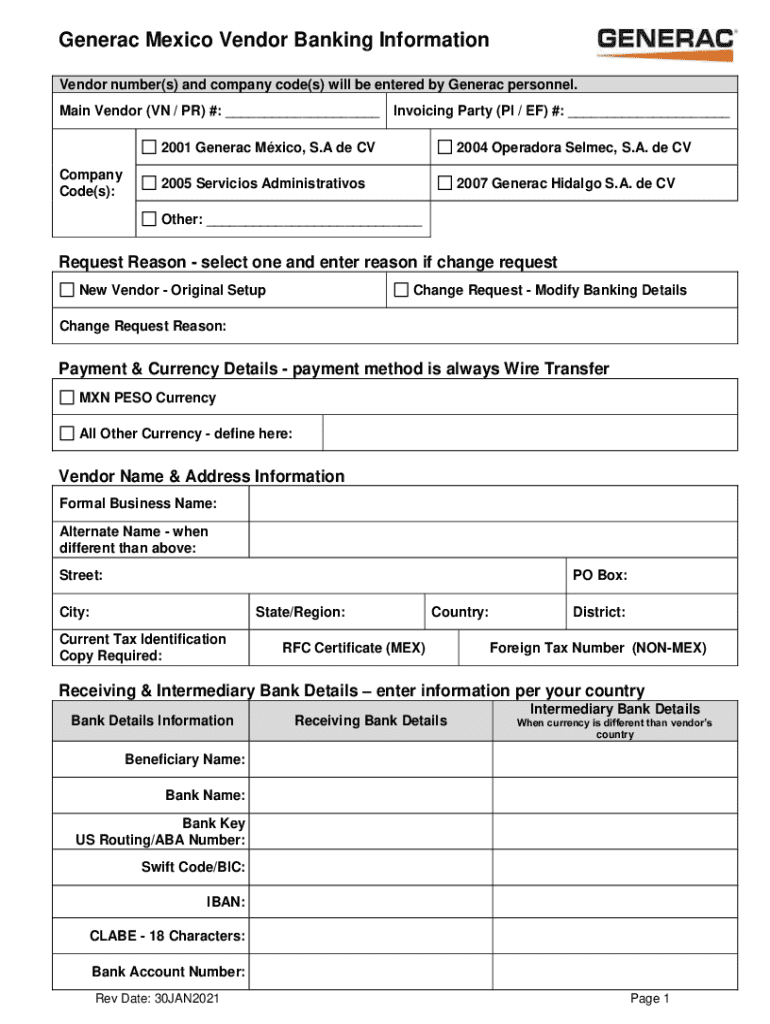 Vendors that engage in financial transactions or maintain a business relationship with Generac Mexico are typically required to file generac mexico vendor banking.
