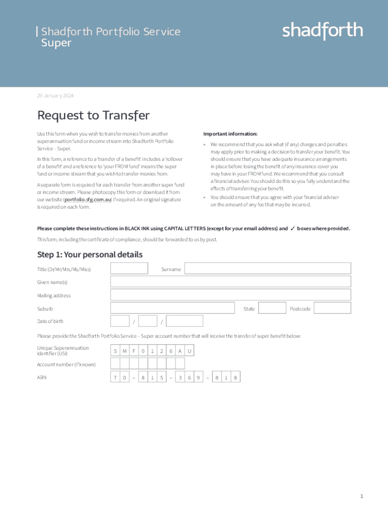 Use this form to transfer funds from another superannuation fund into Shad forth Portfolio Service — Super. Ensure you understand any fees and implications.