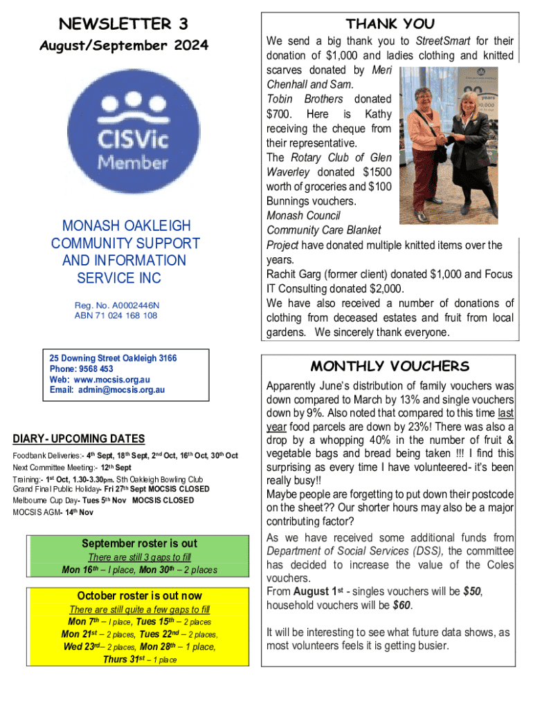 NEWSLETTER 3THANK YOU August/September 2024We send a big thank you to StreetS mart for their donation of $1,000 and ladies clothing and knitted scarves donated by Mere Chen hall and Sam. Robin Brothers