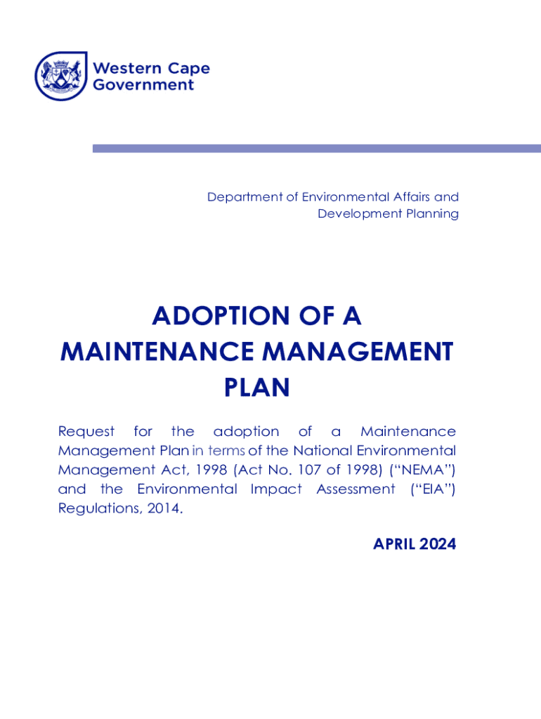 Department of Environmental Affairs and Development PlanningADOPTION OF A MAINTENANCE MANAGEMENT PLAN Request for the adoption of a Maintenance Management Plan in terms of the National Environmental
