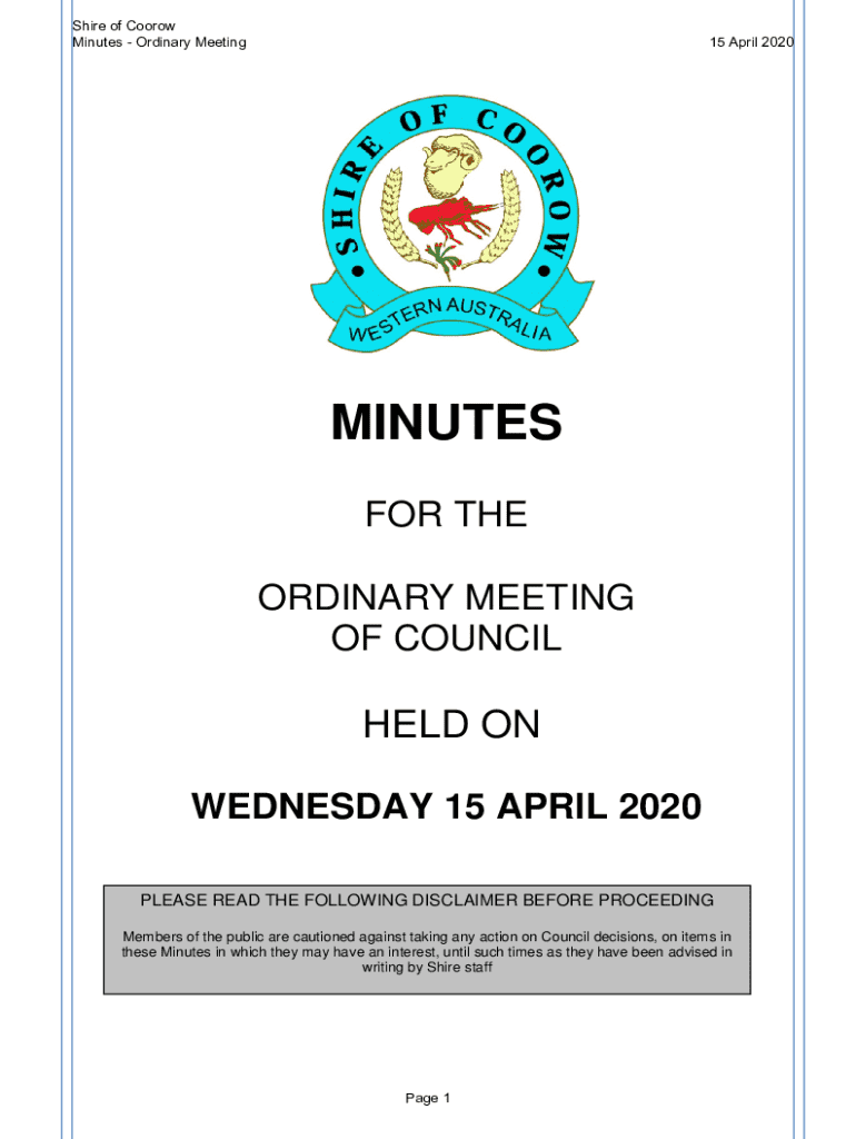 Shire of Coorow Minutes Ordinary Meeting15 April 2020MINUTES FOR THE ORDINARY MEETING OF COUNCILHELD ON WEDNESDAY 15 APRIL 2020 PLEASE READ THE FOLLOWING DISCLAIMER BEFORE PROCEEDING Members of the
