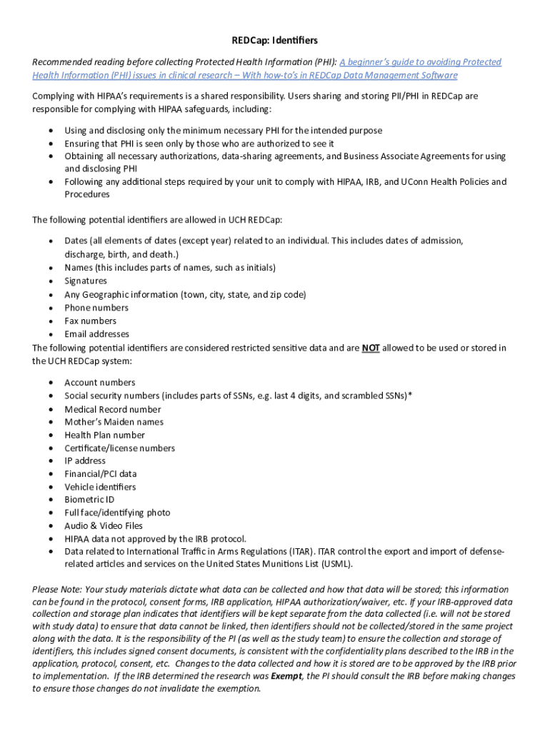 Redcap: Identifiers Recommended reading before collecting Protected Health Information (PHI): A beginners guide to avoiding Protected Health Information (PHI) issues in clinical research With how-tos