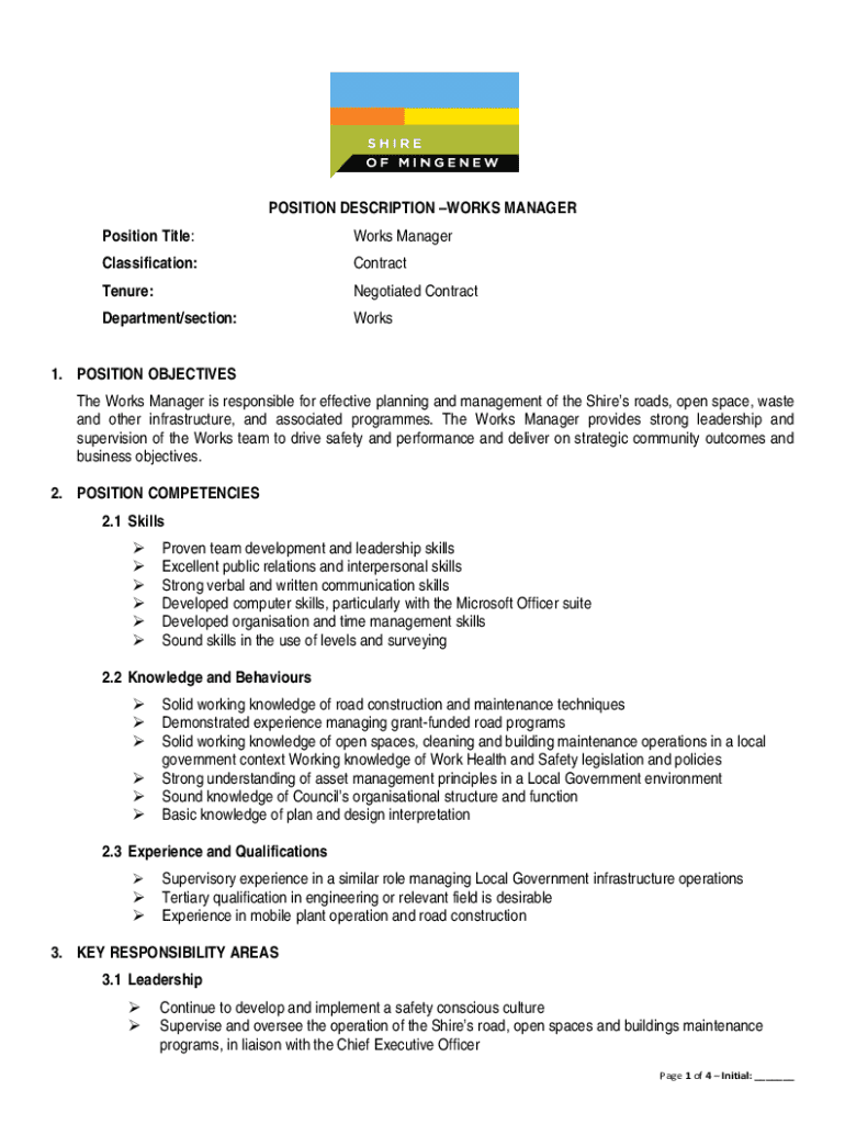 A position description works manager outlines the responsibilities, duties, and qualifications required for the works manager role within an organization.