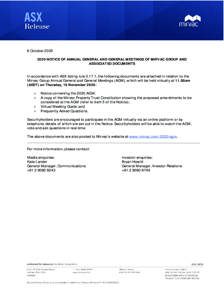 2020 NOTICE OF ANNUAL GENERAL AND GENERAL MEETINGS OF MIRV AC GROUP AND