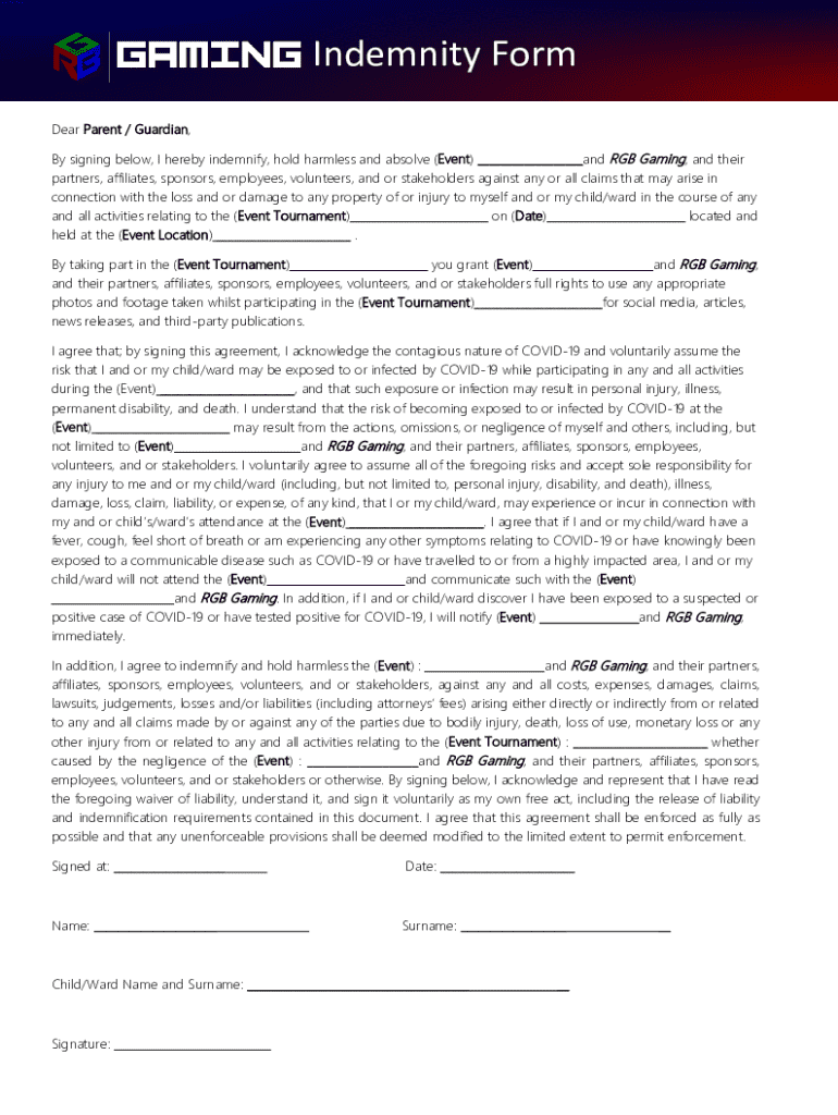 Get the free By signing below, I hereby indemnify, hold harmless and absolve (Event) and RGB Gami...