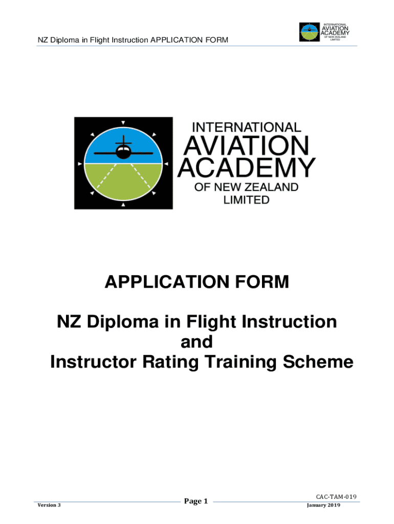 Apply for the NZ Diploma in Flight Instruction and Instructor Rating Training Scheme. Complete your personal details, eligibility, and fee payment information.