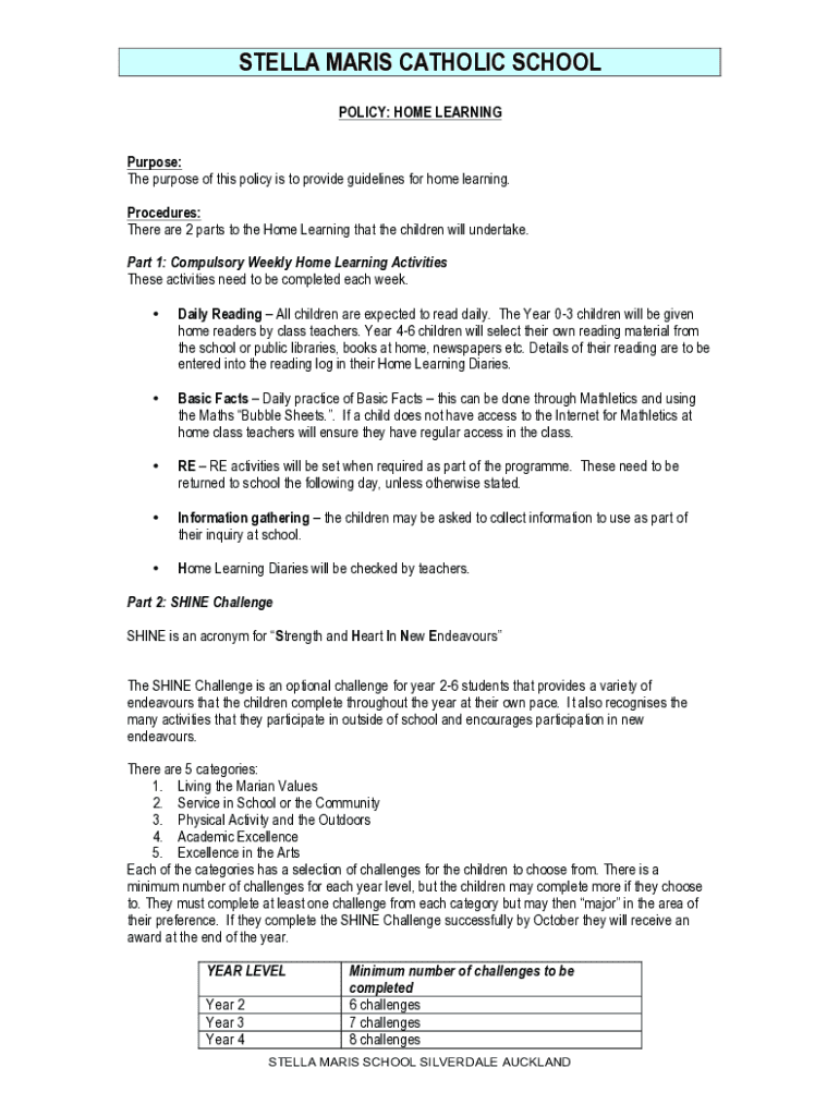 STELLA MARIS CATHOLIC SCHOOL POLICY: HOME LEARNING Purpose: The purpose of this policy is to provide guidelines for home learning. Procedures: There are 2 parts to the Home Learning that the children