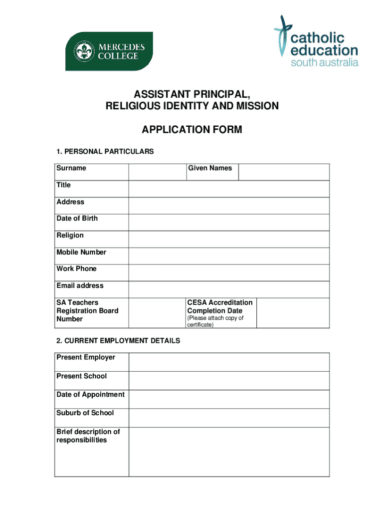 ASSISTANT PRINCIPAL, RELIGIOUS IDENTITY AND MISSION APPLICATION FORM 1. PERSONAL PARTICULARS SurnameGiven Comestible Address Date of Birth Religion Mobile Number Work Phone Email address SA Teachers
