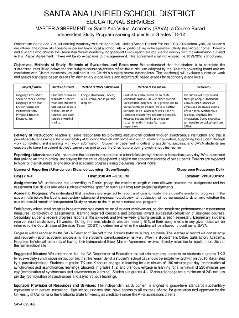 SANTA ANA UNIFIED SCHOOL DISTRICT EDUCATIONAL SERVICES MASTER AGREEMENT for Santa Ana Virtual Academy (SAVA), a CourseBased Independent Study Program serving students in Grades TK12 Welcome to Santa