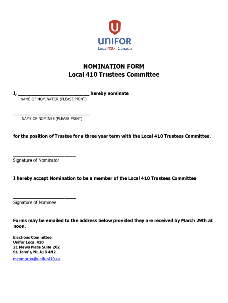 Submit your Nomination for Trustee position in Local 410. Complete the form by March 29th to ensure your candidacy is considered.