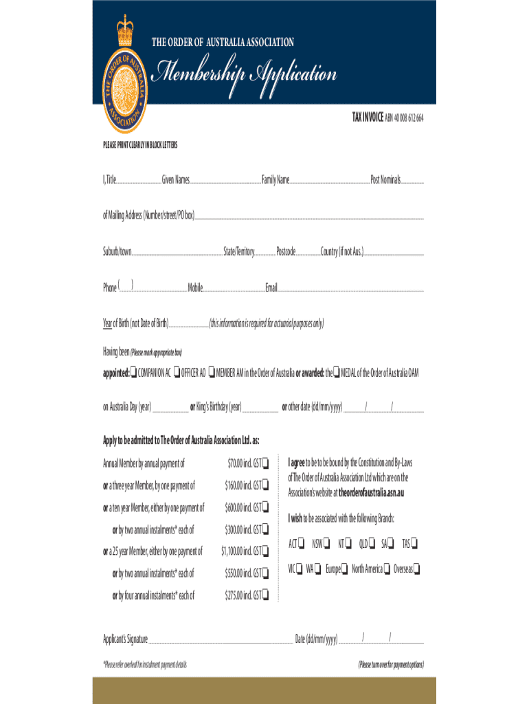 Membership Application THE ORDER OF AUSTRALIA ASSOCIATION INVOICE ABN 40 008 612 664PLEASE PRINT CLEARLY IN BLOCK LETTERS, TitleGiven NamesFamily Name Post Nomination Mailing Address (Number/street/PO