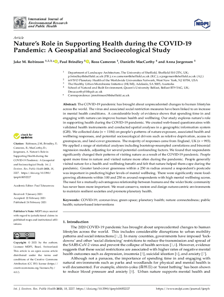 International Journal ofEnvironmental Research and Public HealthArticleNatures Role in Supporting Health during the COVID19 Pandemic: A Geospatial and Socioecological Study Jake M. Robinson 1,2,3,