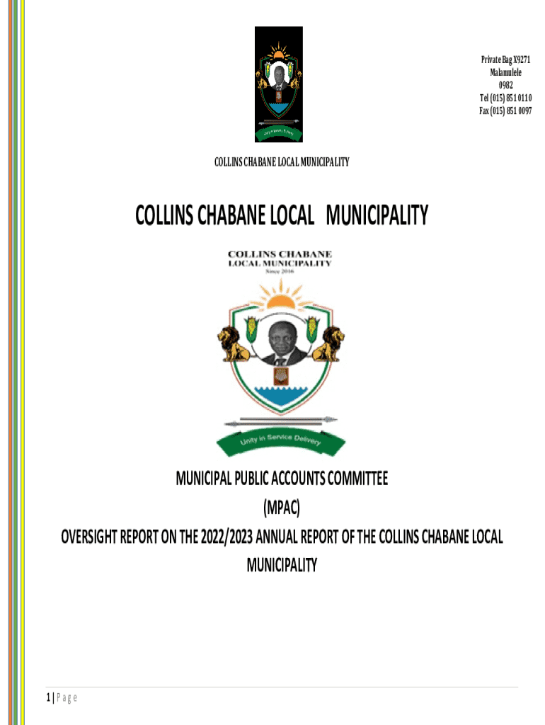 Private Bag X9271 Malamulele 0982 Tel (015) 851 0110 Fax (015) 851 0097COLLINS CHABANE LOCAL MUNICIPALITYCOLLINS CHABANE LOCAL MUNICIPALITYMUNICIPAL PUBLIC ACCOUNTS COMMITTEE (MPAC) OVERSIGHT REPORT